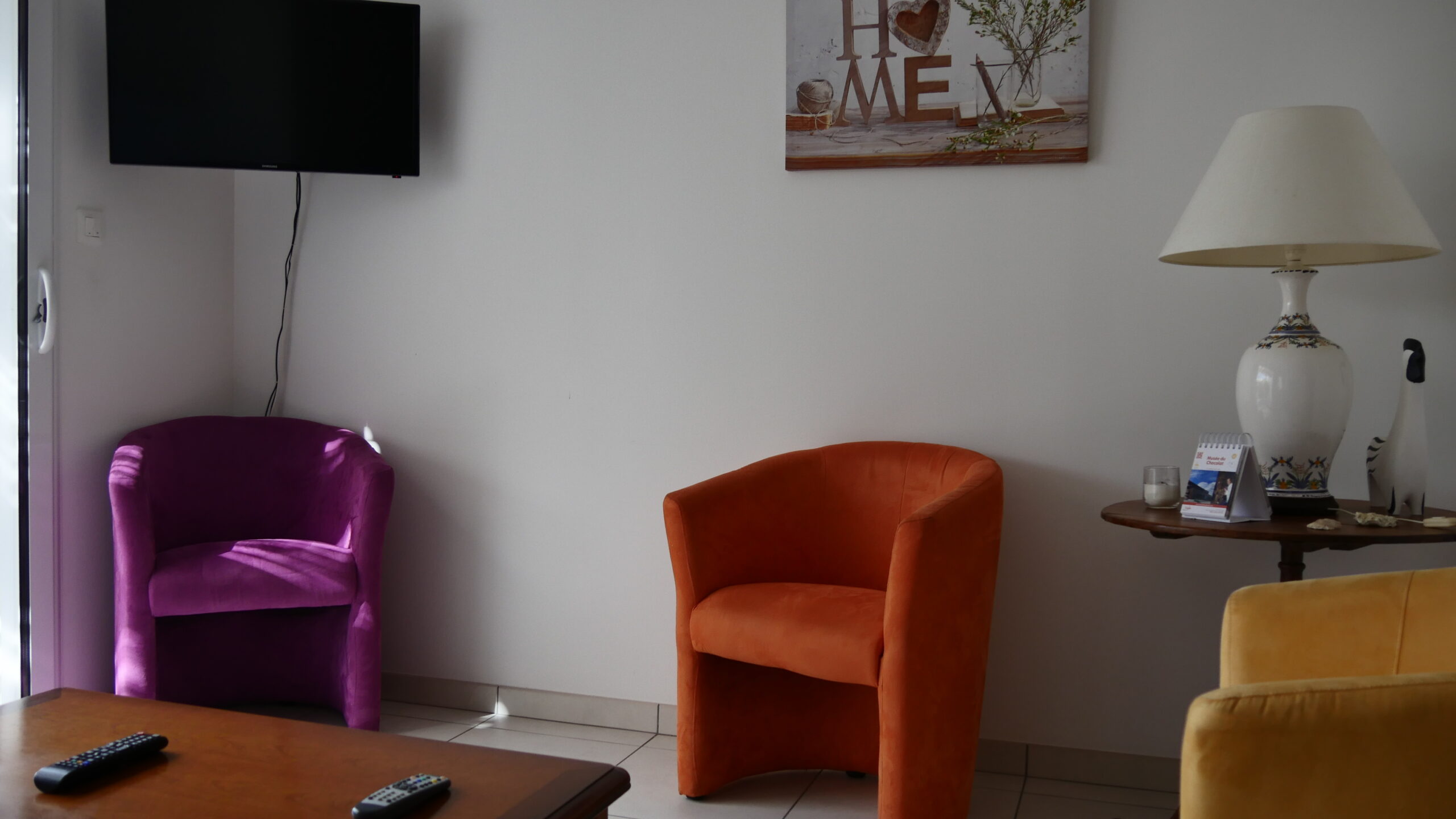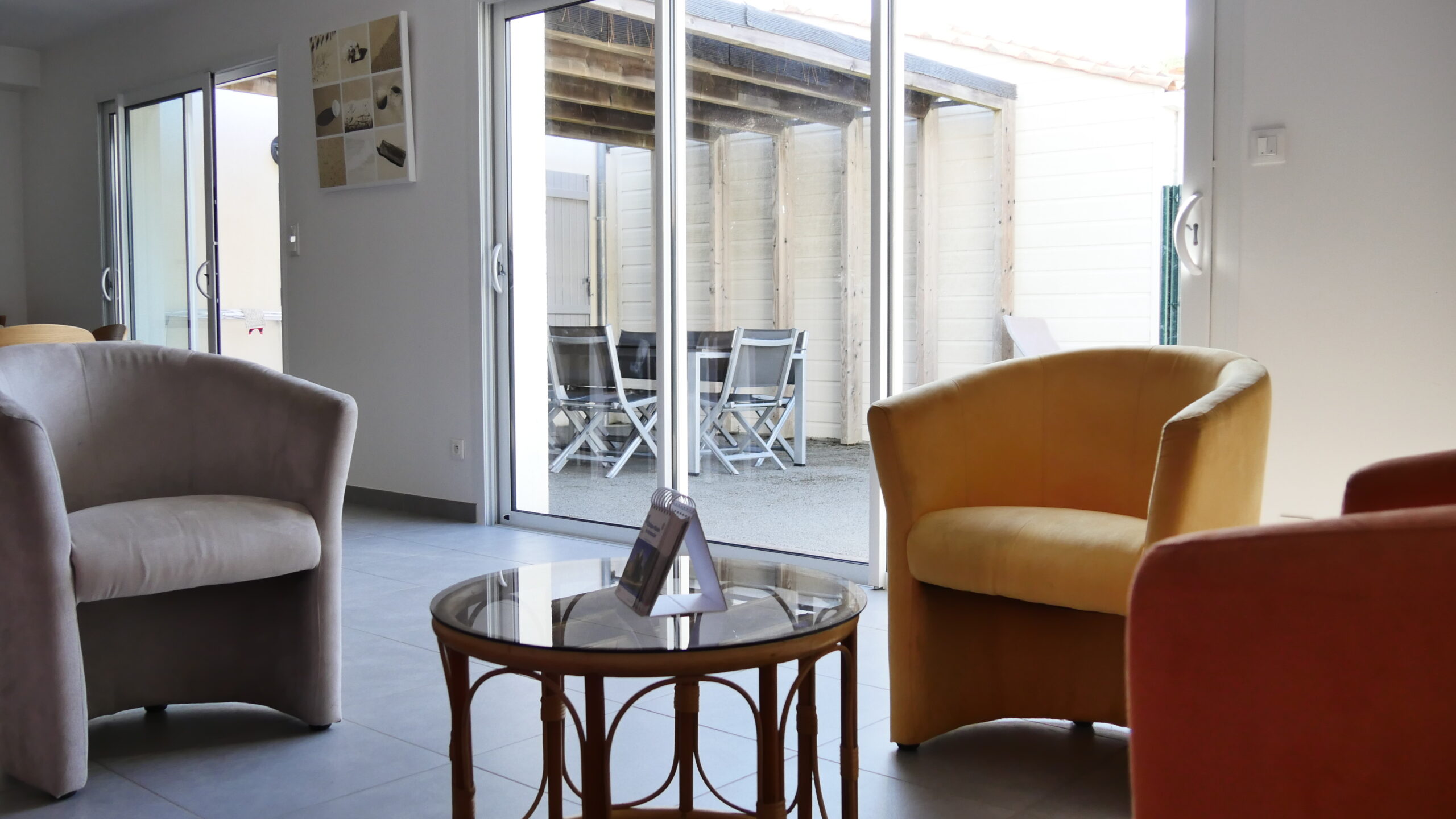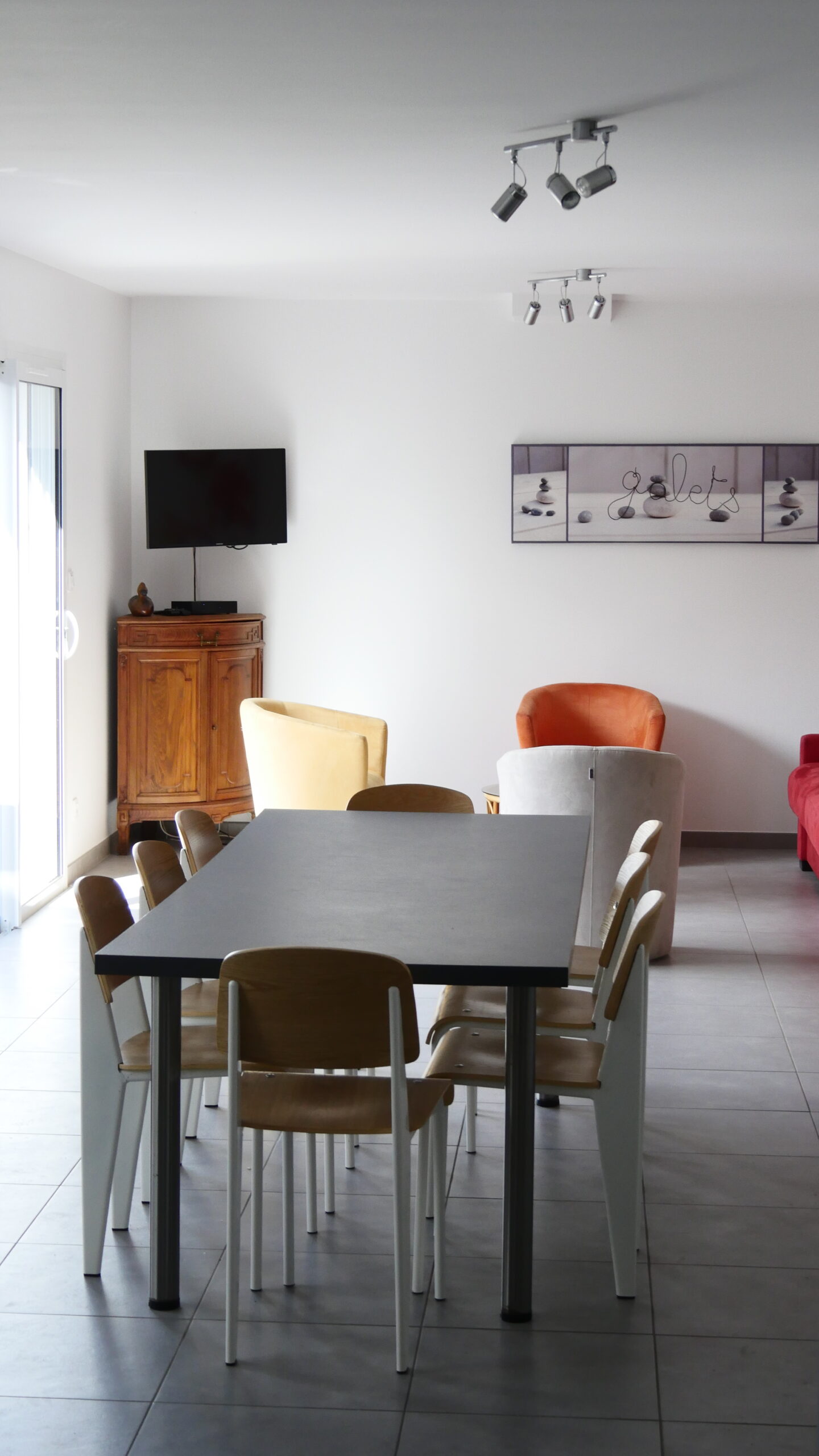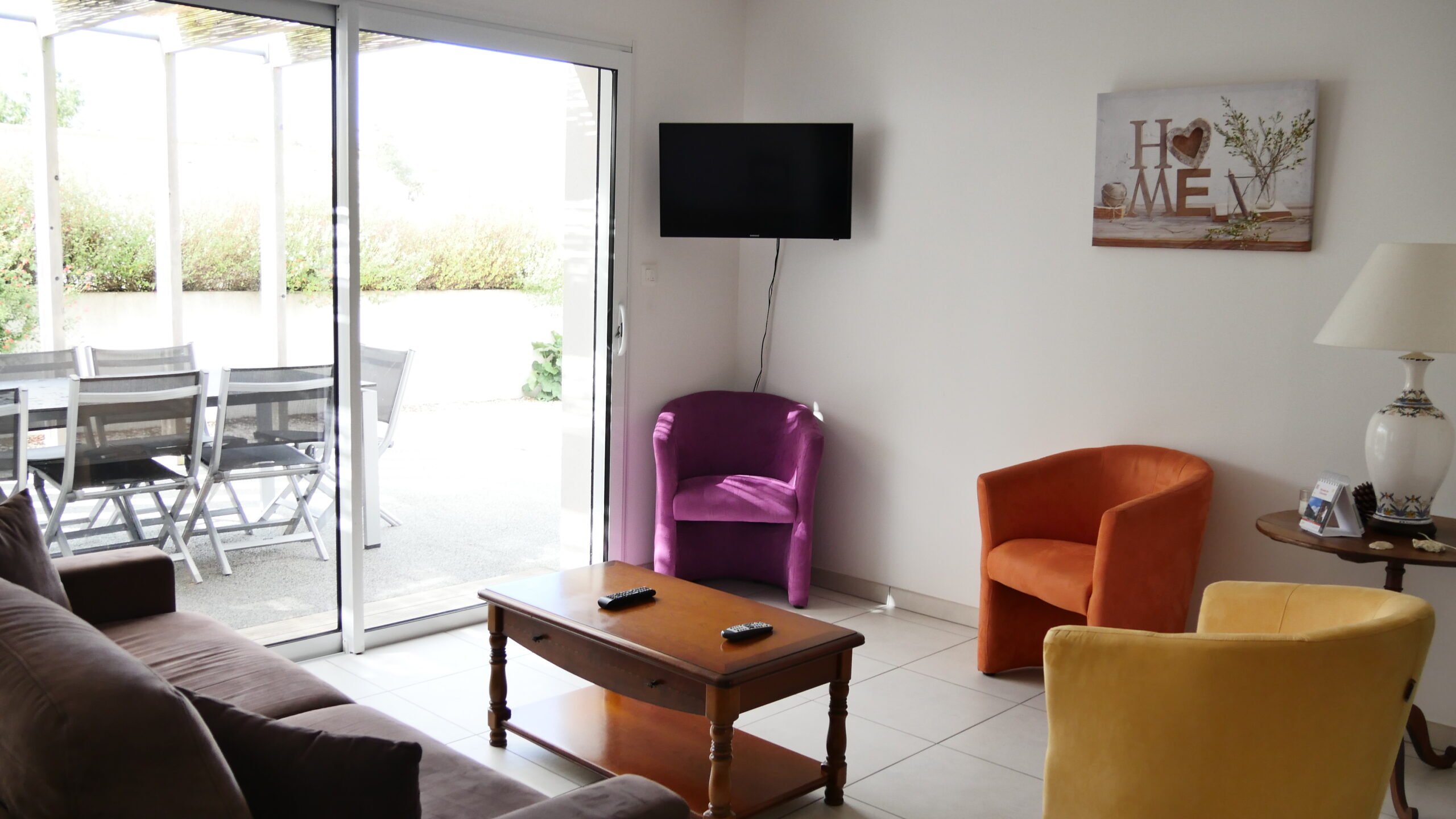 Chacune de nos villas possède un salon-séjour équipé d’une grande table pouvant accueillir jusqu’à 8 personnes, un canapé, des fauteuils et un coin télé avec écran plat.