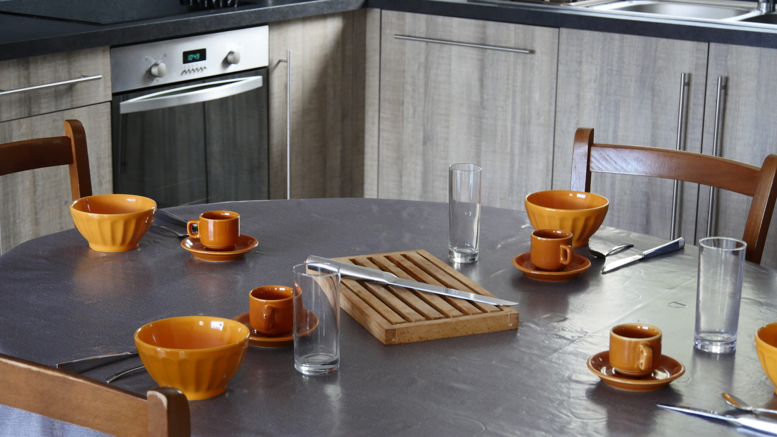 La cuisine est ouverte sur le salon-séjour. Elle est équipée d’un réfrigérateur – congélateur, de plaques vitrocéramiques, d’une hôte, d’un four ainsi que d’un grille pain, cafetière et d’un set de vaisselles, plats de service.